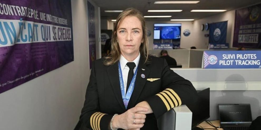 Air Transat pilot and Air Line Pilots Association (ALPA) member Capt. Bibianne Lavallée poses at the Air Transat Pilot Strike Centre in Montreal, Wednesday, Dec. 3, 2025, following a 99 per cent vote in favour of a strike mandate. THE CANADIAN PRESS/Graham Hughes
