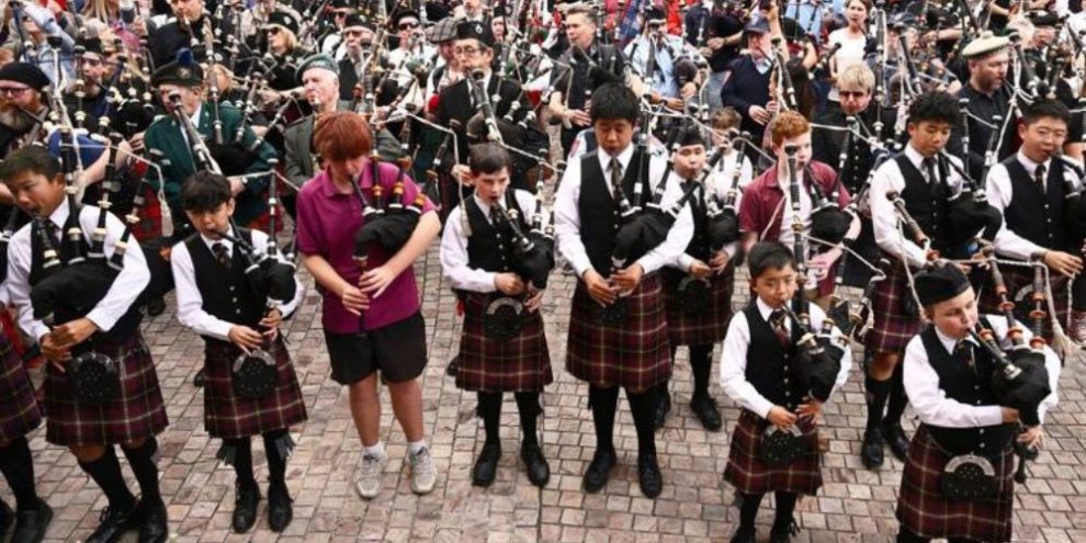 Hundreds of bagpipers claimed a new world record on Wednesday by belting out AC/DC’s rock and roll classic “It’s a Long Way to the Top.”