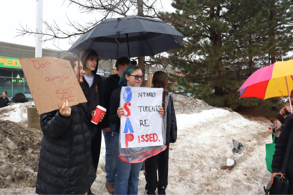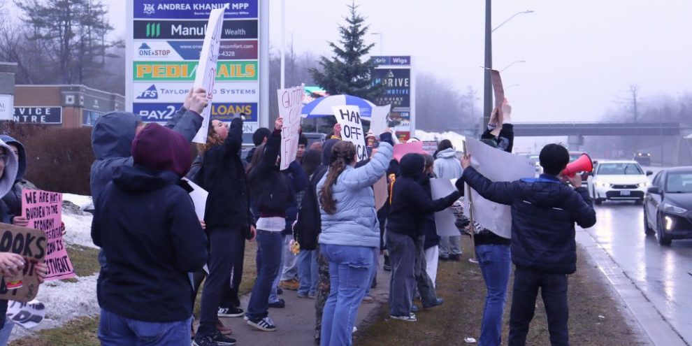 High school students protest cuts to OSAP grants outside MPP Andrea Khanjin's office in Barrie, Ont., Mar. 11, 2026. Photo—Julius Hern/Barrie360.