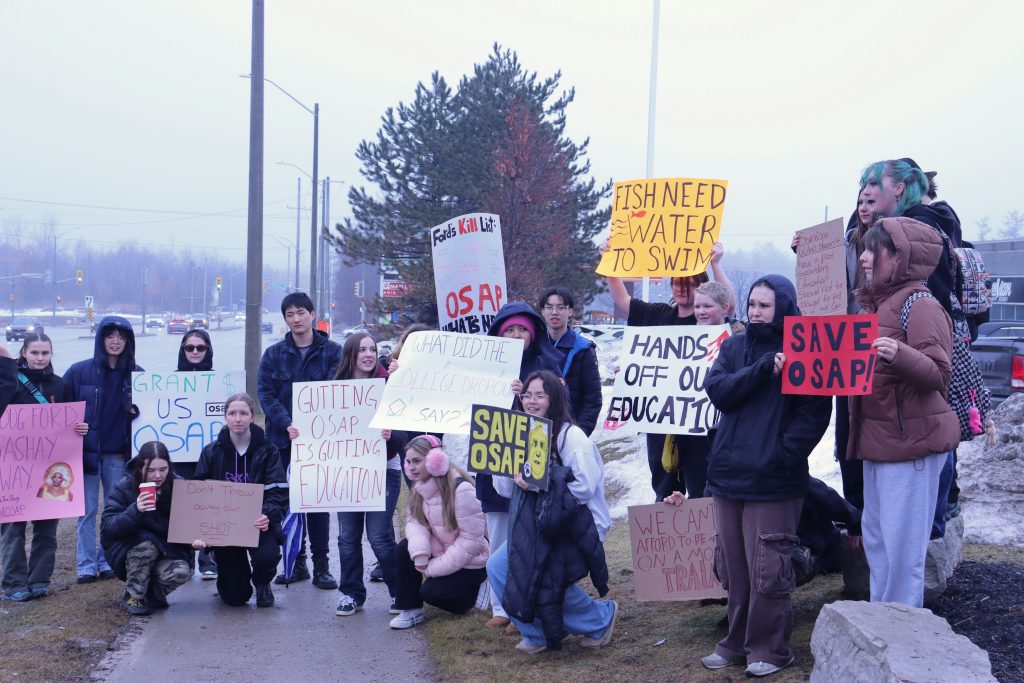 Students marched alongside and drew honks from nearby drivers on Mapleview Drive, many with hand-drawn or handpainted signs, expressing their discontent with how the cuts could affect their upcoming post-secondary careers and financial status.