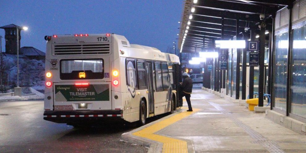 A commuter steps onto a Barrie Transit bus at the Barrie Allandale Transit Terminal in Barrie, Ont., Mar. 19, 2026. Photo—Julius Hern/Barrie360.