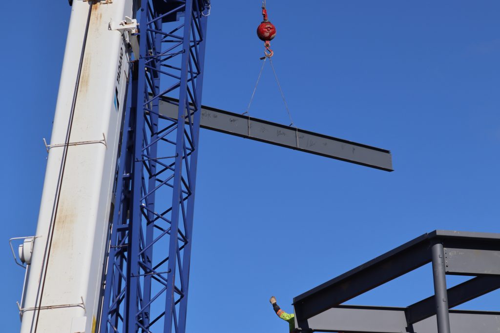 A steel beam signed by YMCA Simcoe-Muskoka officials and others involved with the build of the new facility is raised by a crane toward its eventual installation. Photo—Julius Hern/Barrie360.