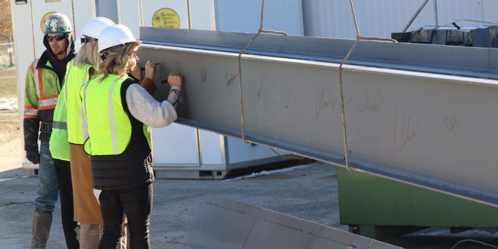 YMCA Simcoe-Muskoka officials, including president and CEO Jill Tettmann sign a steel beam set to make up part of the gymnasium at the new facility in Barrie. Photo—Julius Hern/Barrie360.