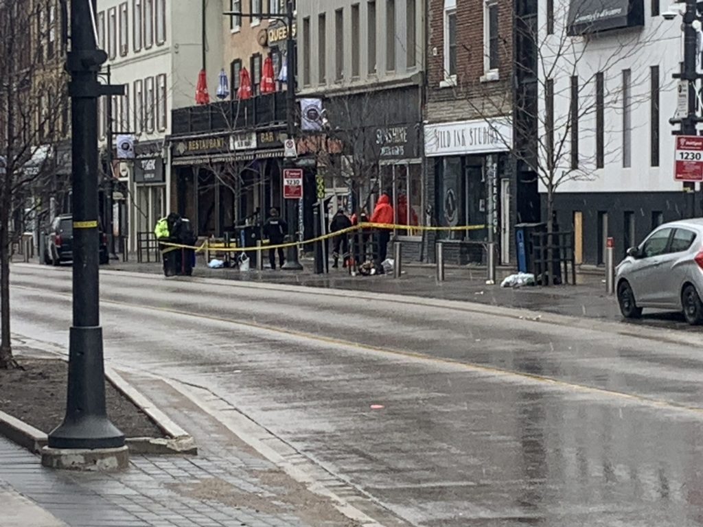 Barrie Police investigate an early-morning shooting on Dunlop Street in Barrie, Ont., Apr. 5, 2026. Photo—Ian MacLennan/Barrie360.