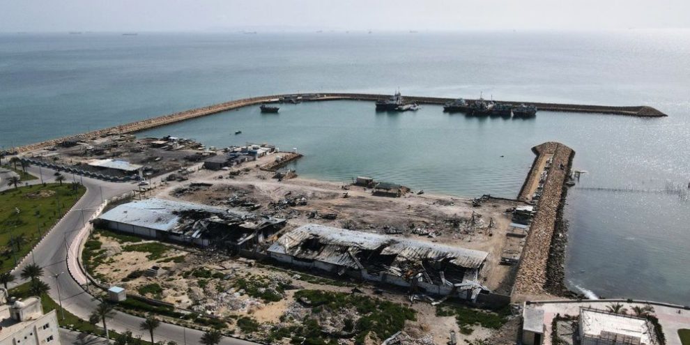 Backdropped by ships in the Strait of Hormuz, damage caused according to local witnesses by recent airstrikes is seen on a fishing pier in the port of Qeshm Island, Iran on Monday, April 13, 2026. (AP Photo/Asghar Besharati)