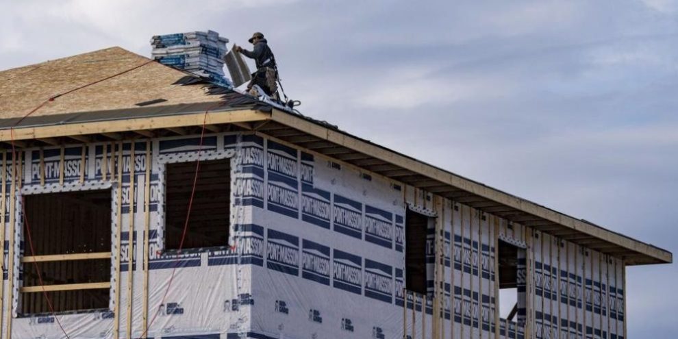 A roofer is seen working on a new housing development in Salaberry-de-Valleyfield, Que., southwest of Montreal on Wednesday, Oct. 22, 2025. THE CANADIAN PRESS/Christinne Muschi