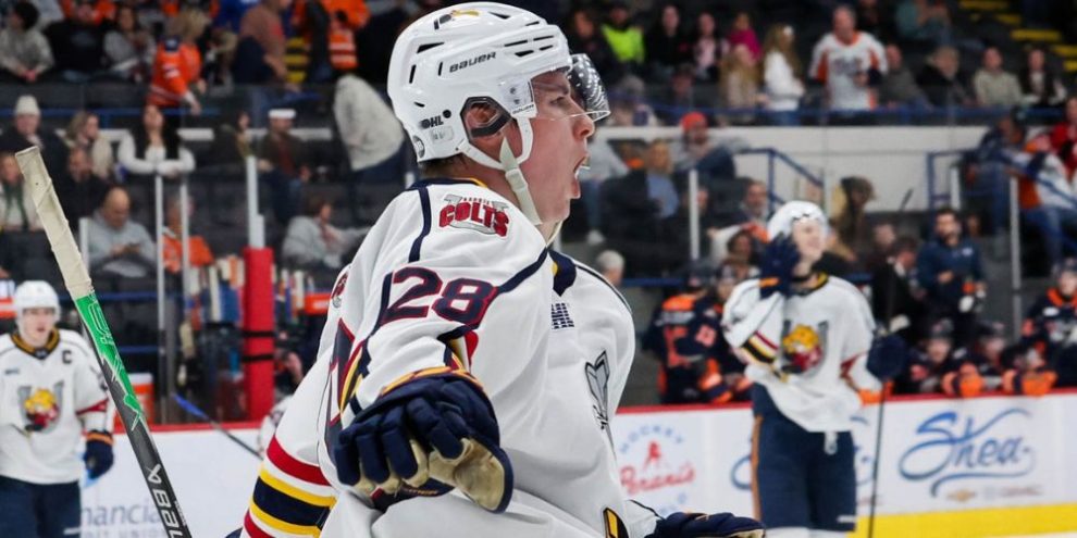 Barrie Colts forward Emil Hemming (28) celebrates his game-winning goal in overtime of a 2025-26 game against the Flint Firebirds at Dort Financial Center in Flint, Mich., Jan. 31, 2026. Photo via Barrie Colts Images.