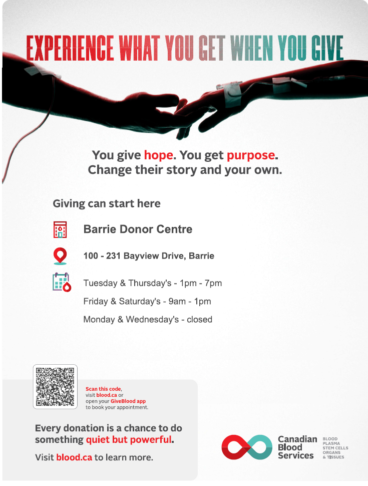 Canadian Blood Services is calling on the community to support their Days of Giving Campaign by donating blood at their Barrie location. Your donation can make a world of difference, especially during this challenging time of year.