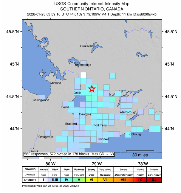 She said the Southern Great Lakes seismic zone has had earthquakes of similar size to the one near Orillia, including rumbles in Owen Sound and Port Hope, and there was a magnitude 5 in Attica, New York in the 1920s.