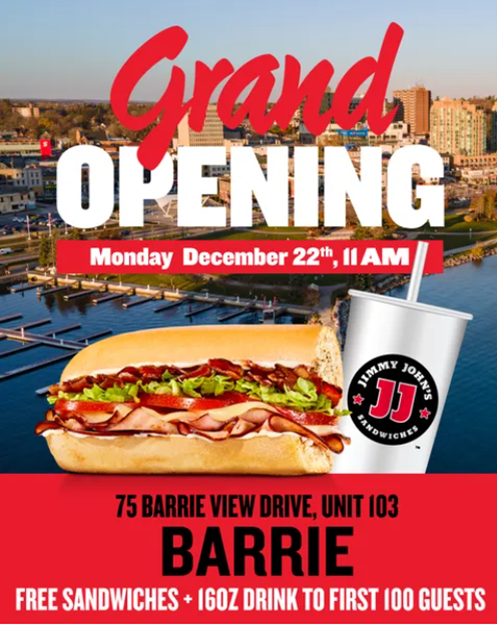 Jimmy John’s is opening its doors in Barrie (103-75 Barrie View Drive, Barrie, ON L4N 8V4) with a grand opening celebration on December 22 at 11 a.m. Guests can look forward to exciting specials all day long. The first 100 customers will receive a free regular sandwich, and $5 regular classic sandwiches will be available all day. In addition, they will be offering free chips and 16oz fountain with the purchase of any large sandwich (make it a combo for free) from Dec 23-26.