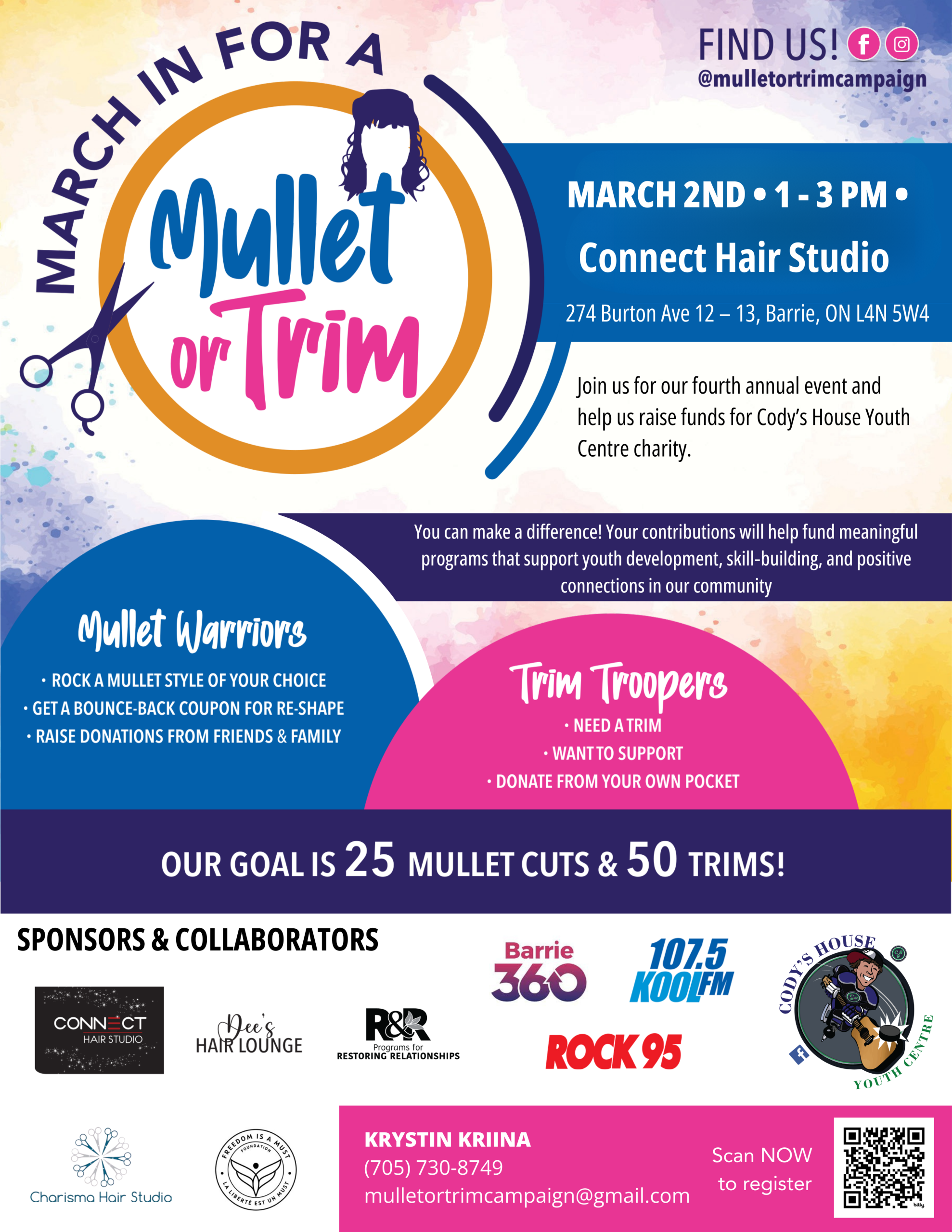 On March 2nd from 1 to 3 in the afternoon, Connect Hair Studio is hosting the Mullet or Trim cut-a-thon fundraiser! Whether you’re ready to embrace a Mullet Warrior look, with that business-in-the-front, party-in-the-back style, or just want a simple trim as a Trim Trooper, you can help support youth programs that make a real difference. As a Mullet Warrior, you'll raise money for programs that empower local youth, helping them develop the skills and resilience they need for a successful future. And don’t worry, you’ll get a coupon for a free reshape in April to keep that mullet fresh! All proceeds go to support Cody's House Youth Centre. Sign up online today, and let's cut for a cause! For more details head to their socails @mulletortrimcampaign