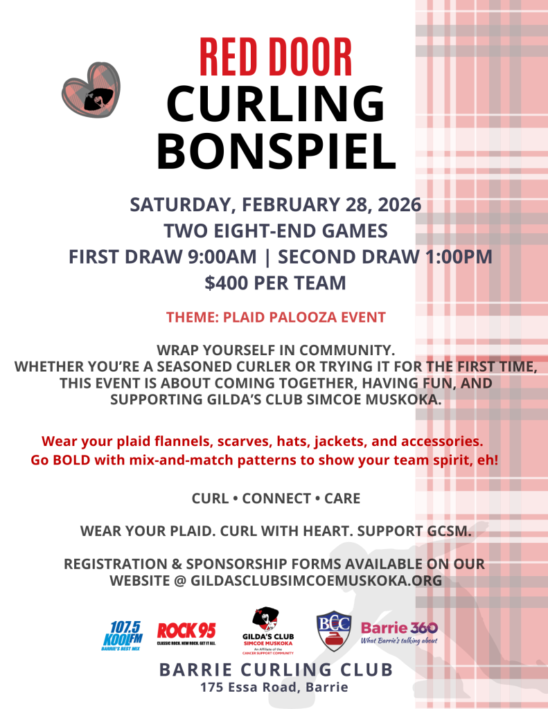 Join us for the Red Door Bonspiel, a fun and meaningful curling event supporting The Red Door at Gilda’s Club Simcoe Muskoka. This community bonspiel brings together curlers, local businesses, and supporters for a day of friendly competition, connection, and impact.