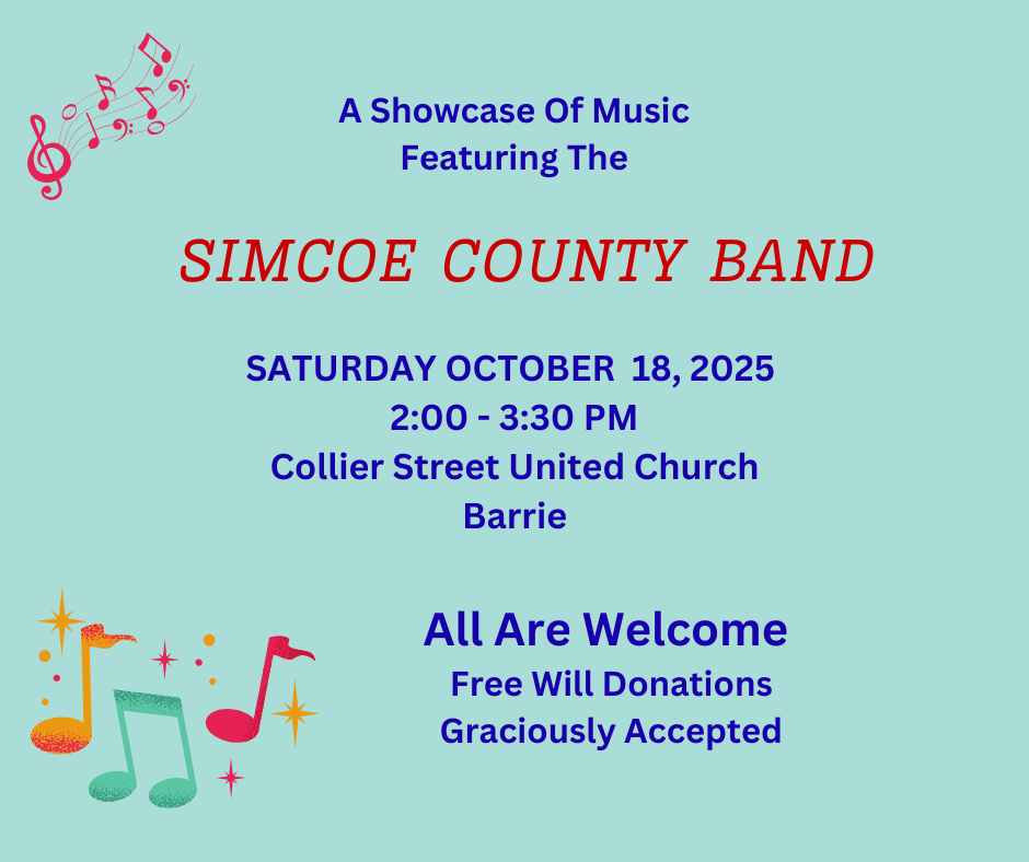 Simcoe County Band is a concert band consisting of 25 members playing a selection of popular music including medleys from classical transcriptions, movies and arrangements of current day popular music. All are welcome to come out and enjoy a musical afternoon