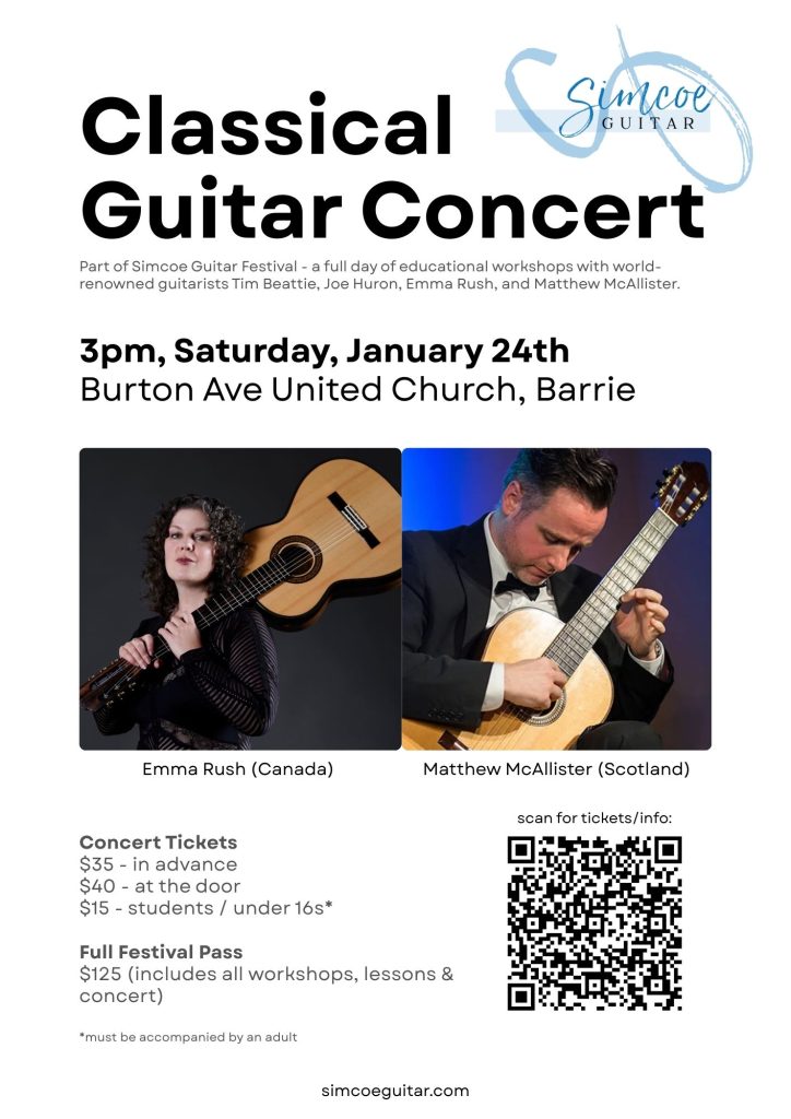 Join us for the inaugural Simcoe Guitar Festival on Saturday, 24 January 2026, at the Burton Ave United Church in Barrie.
