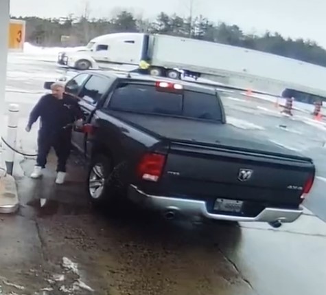 This image taken from surveillance video at a gas station shows the suspect linked to the theft of a pickup truck (pictured) in Gravenhurst Ont., Jan. 14, 2026. Image provided by Bracebridge OPP.