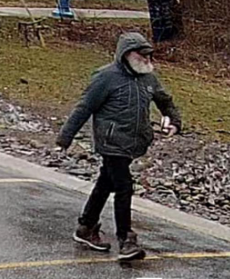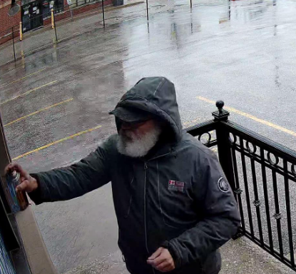 The suspect is described as a white male, between 50 and 60 years old, with a grey beard. At the time, he was wearing a black baseball cap, a grey jacket featuring Canadian and American flags on the chest, black pants, and brown boots.