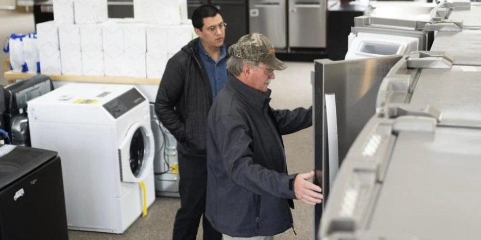 Riegelmann's Appliance employee Noah Guillen helps Dave Scherer, right, as he shops for a refrigerator, in Gresham, Ore., Thursday, April 3, 2025. (AP Photo/Jenny Kane)