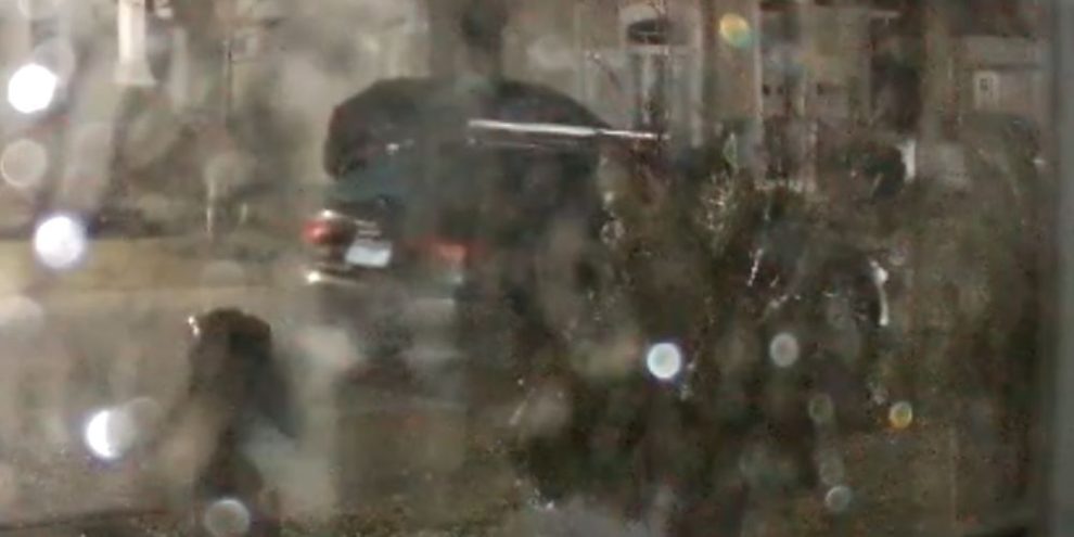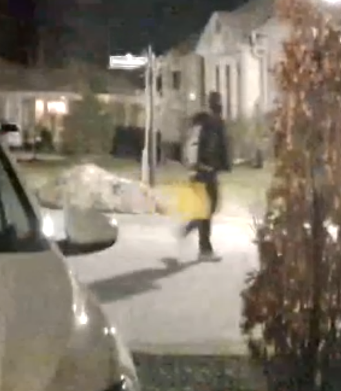 The male suspect's vehicle shown on camera is described as a dark coloured Audi Hatchback that was seen in the area shortly after 3 a.m. His appearance is described as wearing a dark sweater with a light-coloured stripe across the chest and arms.