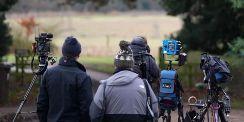 Journsalists wait at the entrance gate of the Sandringham Royal Estate in Sandringham, England, Friday, Feb. 20, 2026 after Andrew Mountbatten-Windsor was arrested and held for hours by British police on suspicion of misconduct in public office related to his links to Jeffrey Epstein.(AP Photo/Alastair Grant)