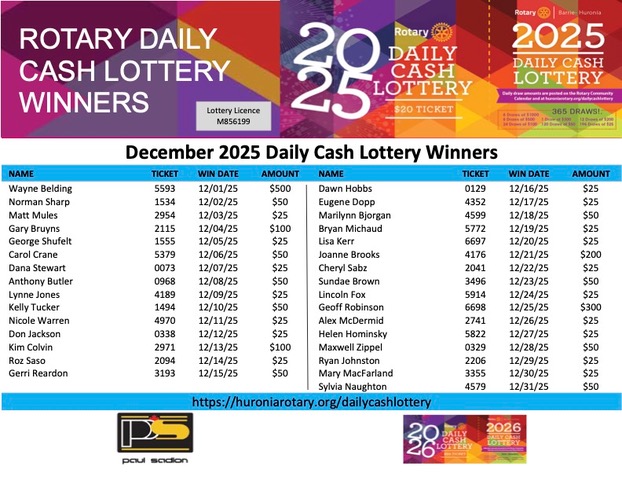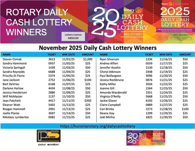 Rotary Club Barrie-Huronia Daily Cash Lottery: Info, Winners, and more