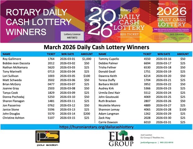 The Rotary Club of Barrie-Huronia is pleased to announce the winners of their Daily Cash Lottery for this month. Head to their website for more information on the project.