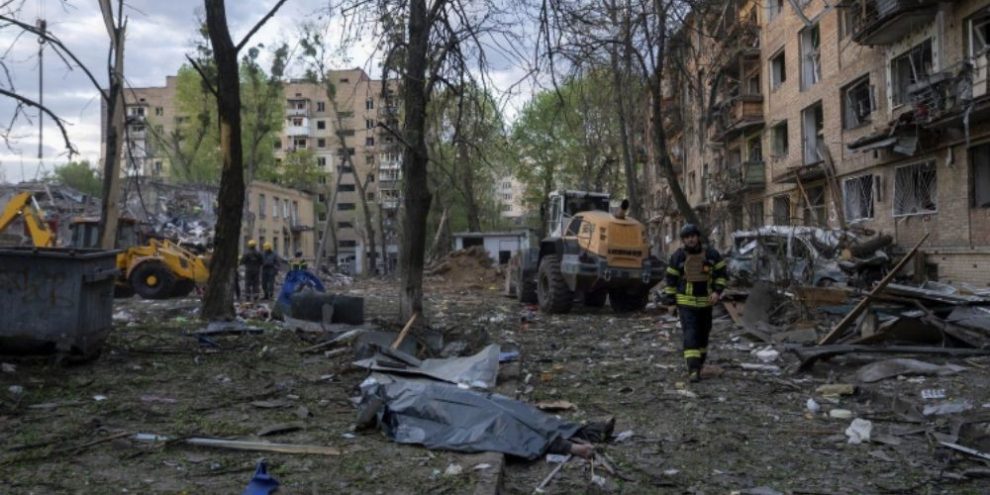 At a Kyiv residential building that was almost entirely destroyed, emergency workers removed rubble with their hands, rescuing a trapped woman who emerged from the wreckage covered in white dust and moaning in pain.