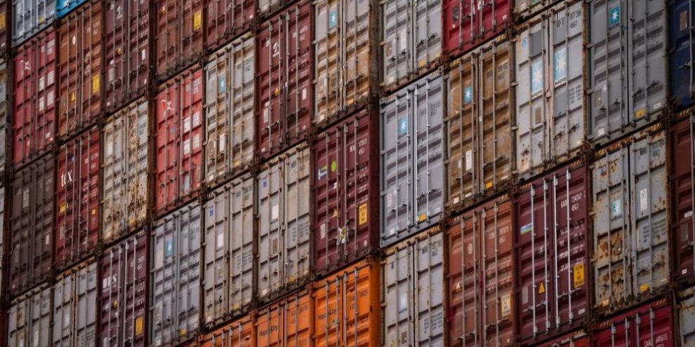 Cargo containers are seen stacked on the Hapag-Lloyd container ship Frankfurt Express while docked at the DP World Centerm container terminal, in Vancouver, on Sunday, Aug. 3, 2025. THE CANADIAN PRESS/Darryl Dyck