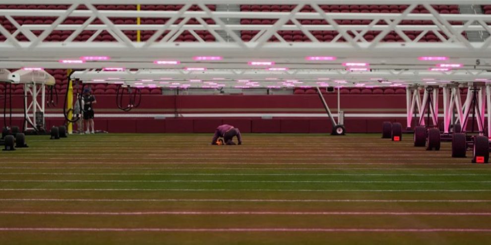 A worker kneels under grow lights on the field at Levi’s Stadium as it is prepared for the NFL’s Super Bowl LX football game in Santa Clara, Calif., Tuesday, Jan. 20, 2026. (AP Photo/Jeff Chiu)