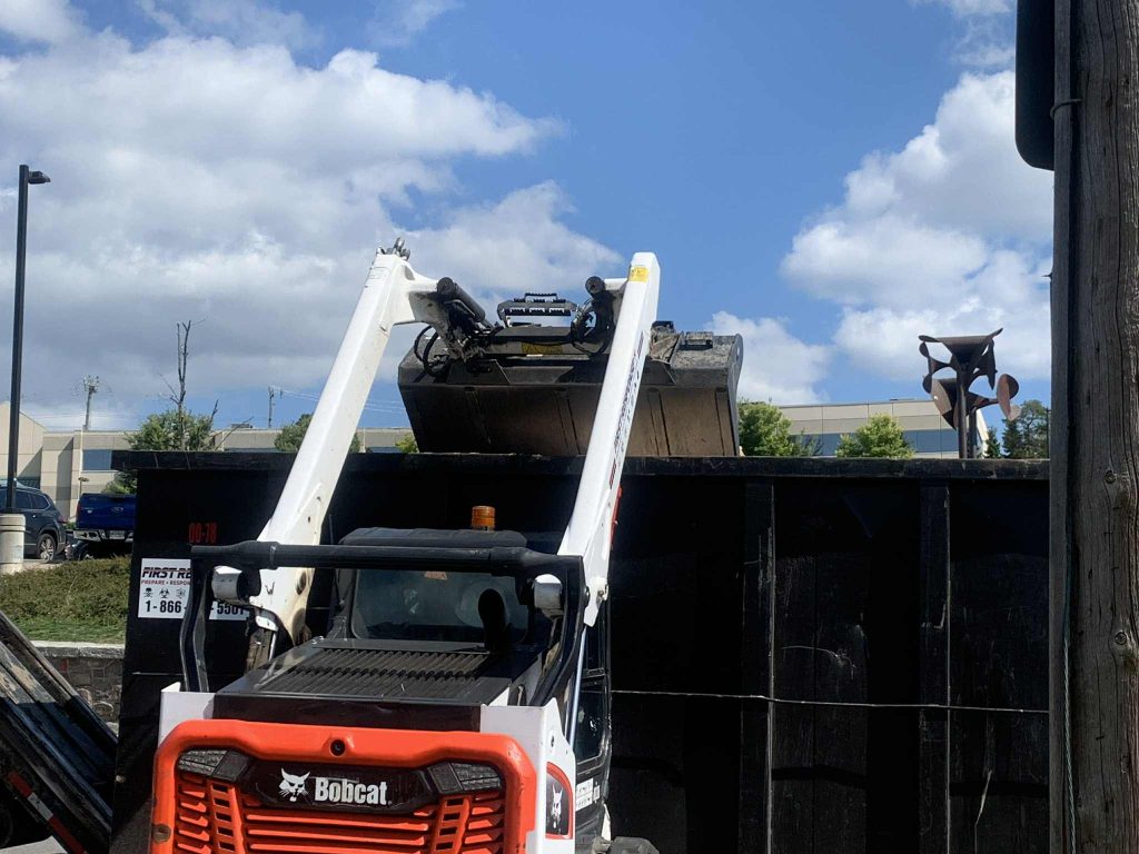 A section of Mulcaster Street in the area of Codrington and Worsley Streets was blocked off for the clean-up, as vehicles, including Bobcats, lifted debris into a bin, and recycling bins were placed in a lot at the Busby Centre.