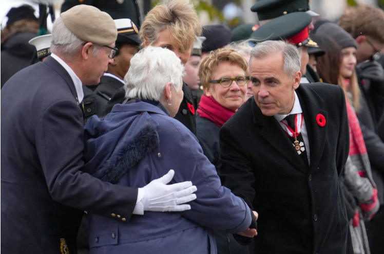Silver Cross Mother Nancy Payne laid a wreath during the ceremony on behalf of mothers whose loved ones died in service. Prime Minister Mark Carney, with his wife Diana, paused briefly as he laid his wreath to flatten out the ribbon at its edge.
