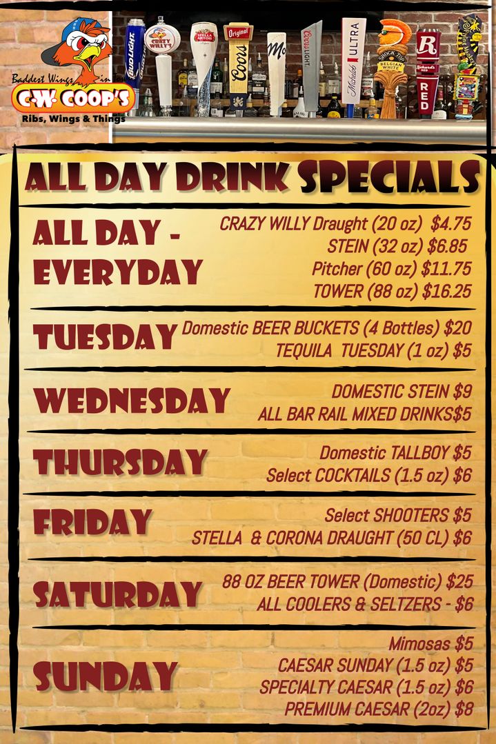 CW Coops has daily specials starting at $4.75 including $5 Tequilas on Tuesday, $5 shooters on Friday, $25 Beer Towers on Saturday, and $5 Ceasars and mimosas on Sundays. Not sure what to pick, enjoy 2 drinks for $10 Monday to Friday from 3 to 6 PM.