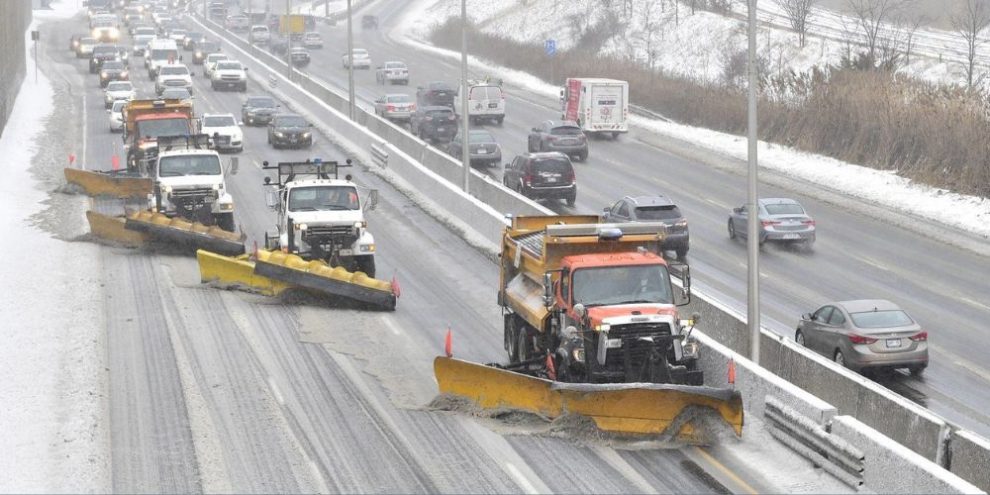 A line of snow plows clears the Gardiner Expressway in Toronto on Tuesday, Feb.12, 2019, after a winter storm hit the region. A huge winter storm is sweeping across Ontario, bringing everything from freezing rain to high winds. (FILE PHOTO) THE CANADIAN PRESS/Frank Gunn